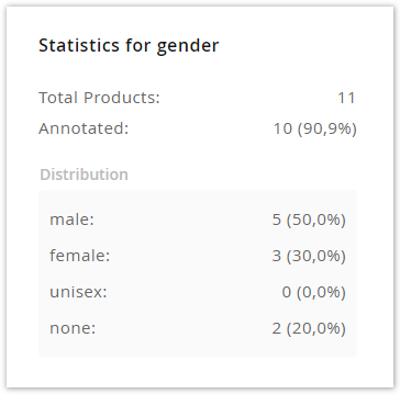 On the top, the total number and the number of annotated products are displayed. The second number and its percentage are especially helpful during annotation, as the prediction model needs a certain amount of products to be able to learn the most likely attribute value of unknown (not annotated) products.