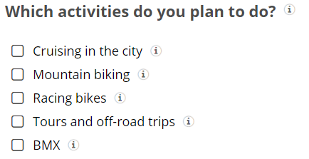 - e.g. the Question "Which bike types do you like?" with the answer options "race bike" and "mountain bike" and "BMX"