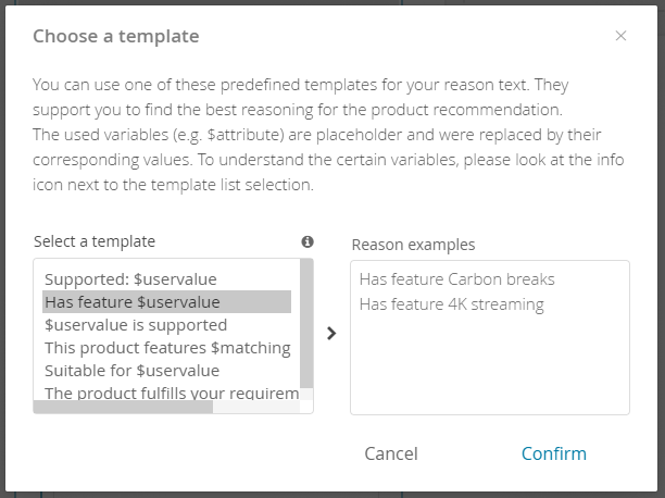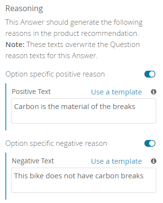 Negative Text | So let's adapt the example above and assume that a bike does not have the desired carbon brakes. In this case, you can enter the text "Unfortunately, this bike does not have $uservalue" which results into the product reason text "Unfortunately, this bike does not have carbon brakes." |