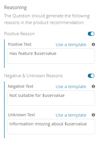 The Reasoning settings define what kind of feedback your user receives in the result list of your recommendation phase. This page gives you an overview of all the available settings, shows you the difference between positive and negative reasoning texts and provides with you with a list of convenient reason variables for the ability to customize your result lists even more.