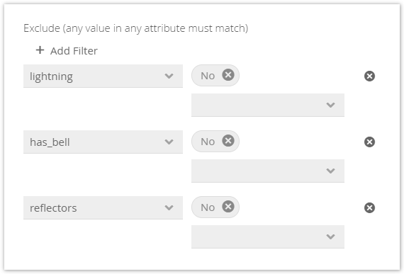 The example below removes all bikes which do not have lights, a bell and reflectors. In combination with the include filter which gives only city bikes, a set of bikes, which may be legally used in cities, is available in the Product Guide.