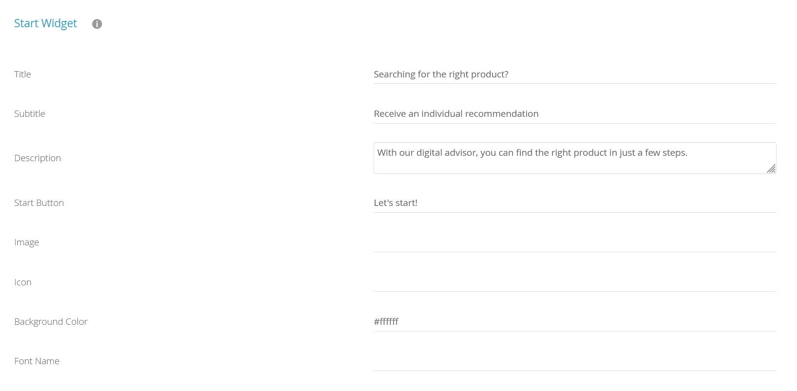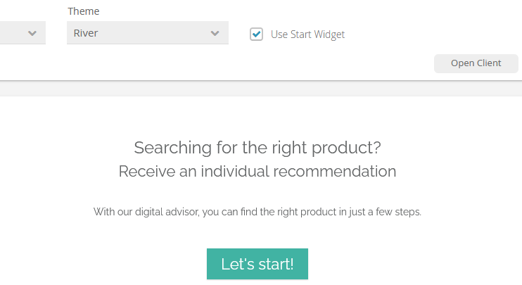 Please insert the integration code with the Start Widget parameter into your website at the position, where you want to display the Start Widget and the corresponding Product Guide.