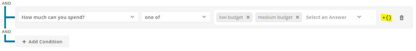 Clicking the button with the caption "+( )" creates a group around the corresponding condition row. With the new subgroup, a new logical operator selection is added too. That allows you to change the logical operator within this group to create more complex condition trees.