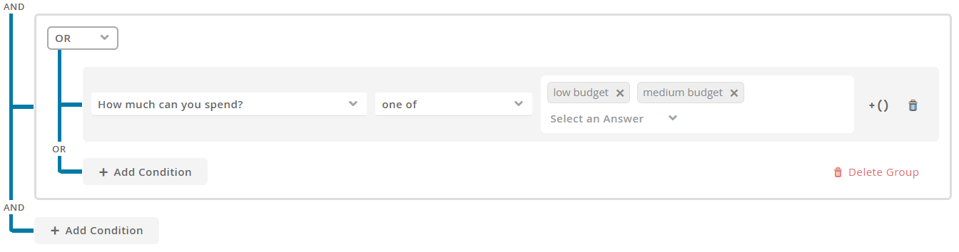 All source questions can be connected with a logical AND (all conditions have to be fulfilled) or with an OR operator (at least one has to be fulfilled) or with a combination of both using nested subgroups. These combinations allow you to define multiple choice branches when a target option should be selected/highlighted. For more information about the settings of a single condition, please read the next sections below.